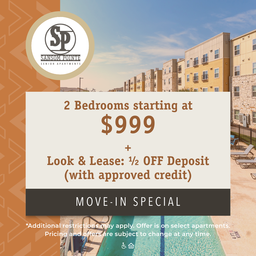 At Sansom Pointe Senior Apartments, we believe life after 55 should be vibrant, fulfilling, and free from the stress of everyday worries! Located only 15 minutes from the heart of Fort Worth, Texas, our modern and affordable 55+ community is designed to make your retirement years the best yet. Whether you’re seeking a peaceful home or an active social scene, we’re confident you will find it at Sansom Pointe.